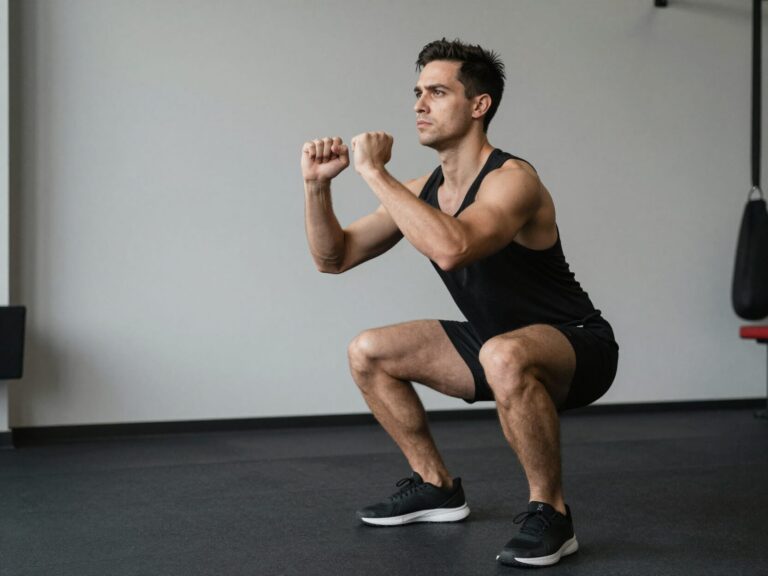 Ankle Circles + Calf Raises — 30 sec each foot: Ensures full dorsiflexion for deep squat mechanics. Limited ankle mobility is a hidden cause of poor squat depth and forward knee collapse.
